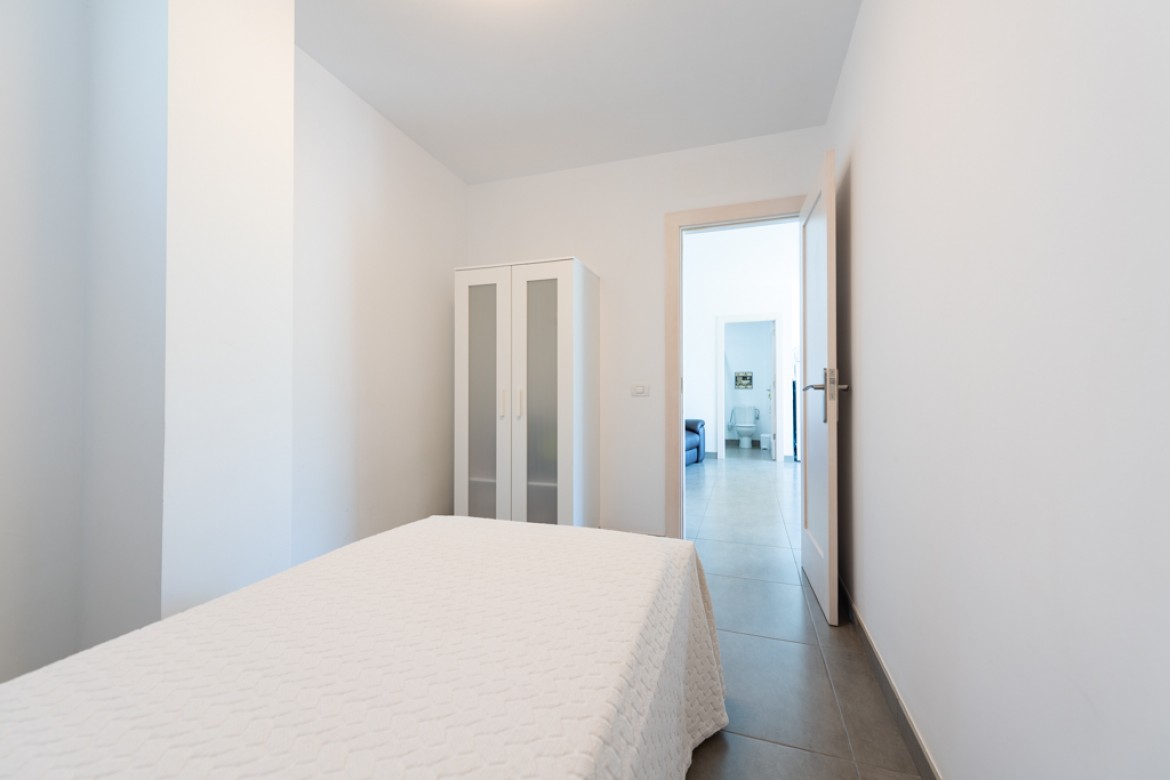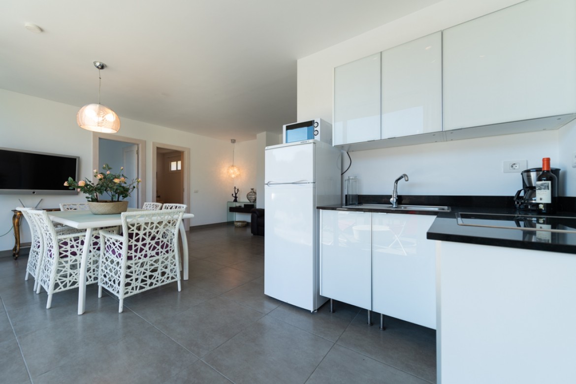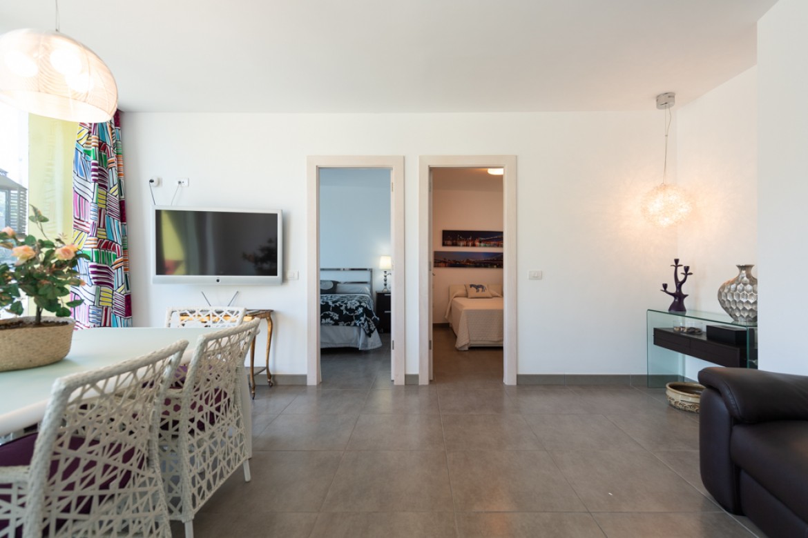 Apartamento de 60m² con dos dormitorios, cocina, salón, comedor, cuarto de baño con plato de ducha y terraza con vistas a la piscina.