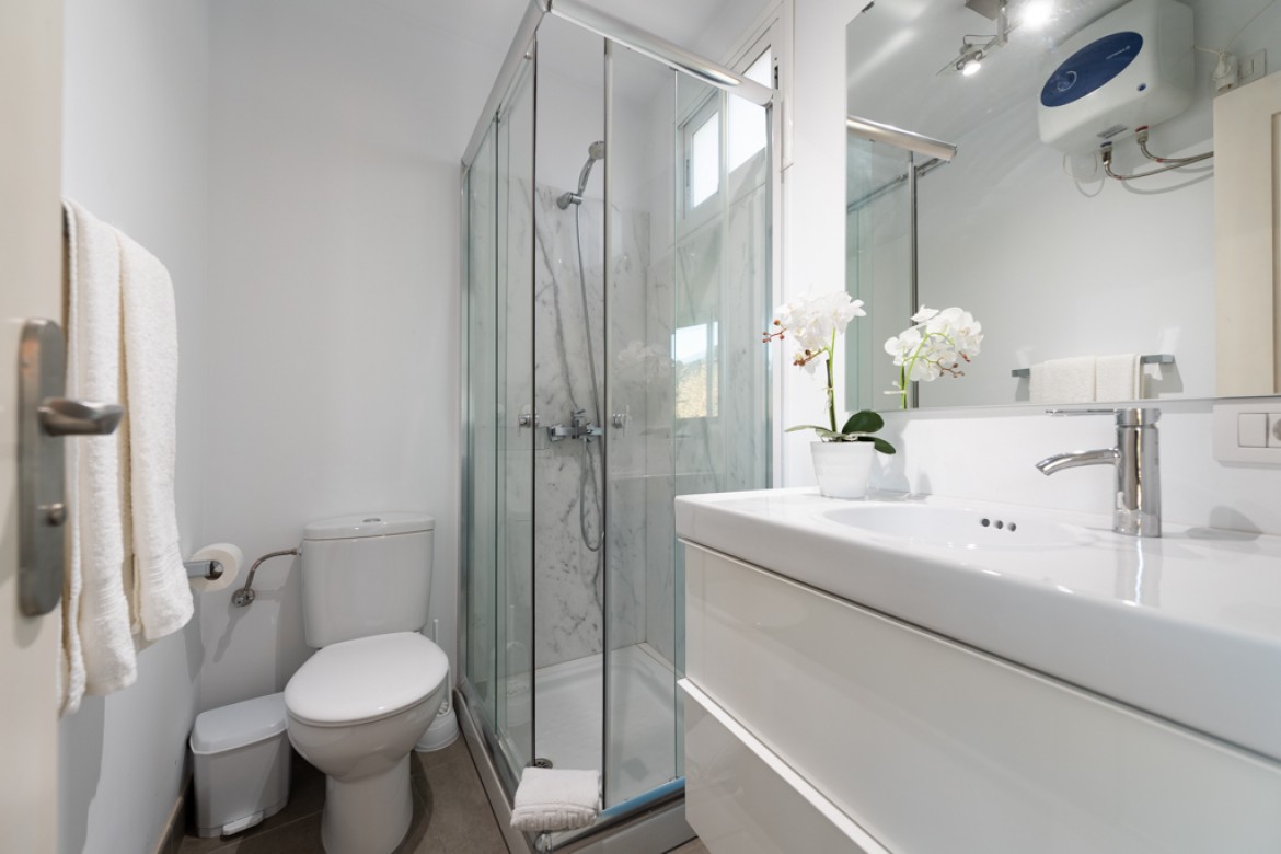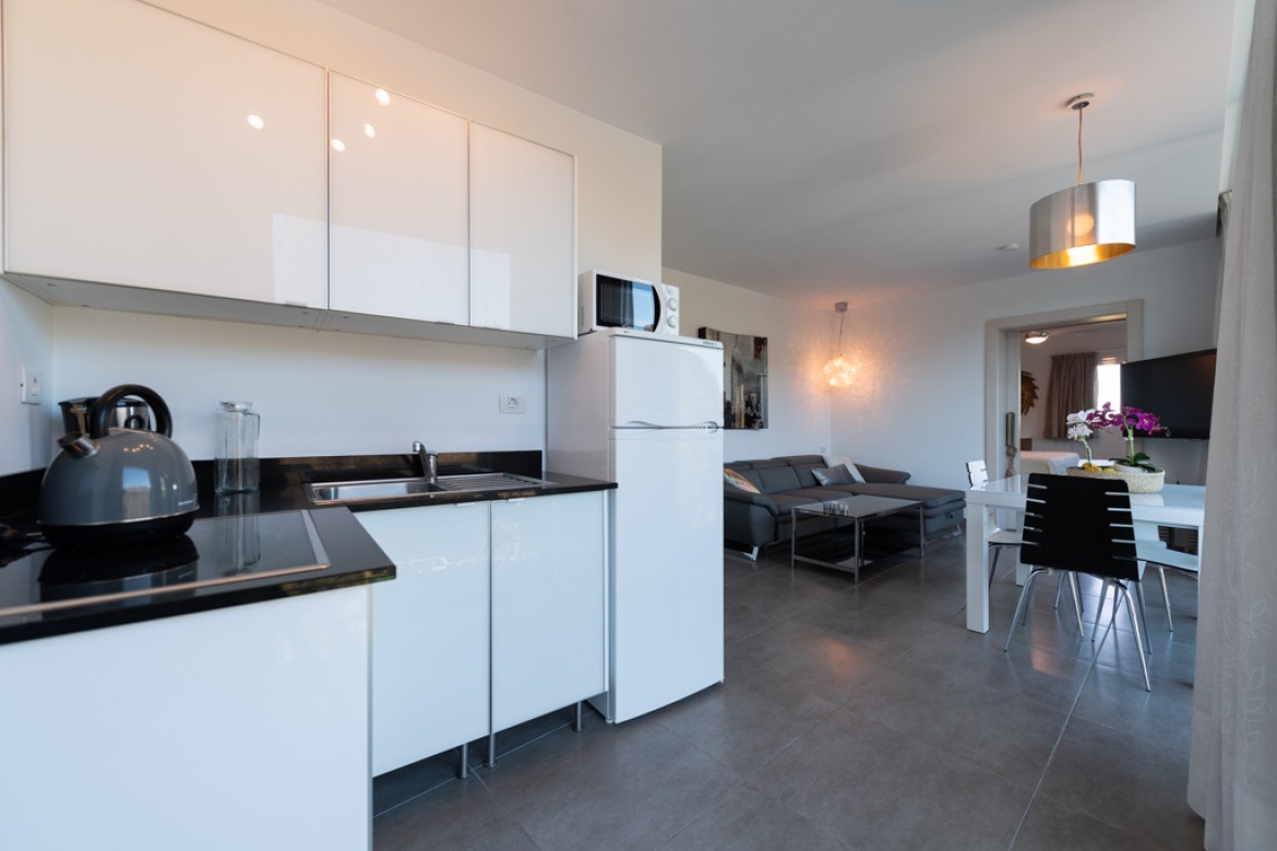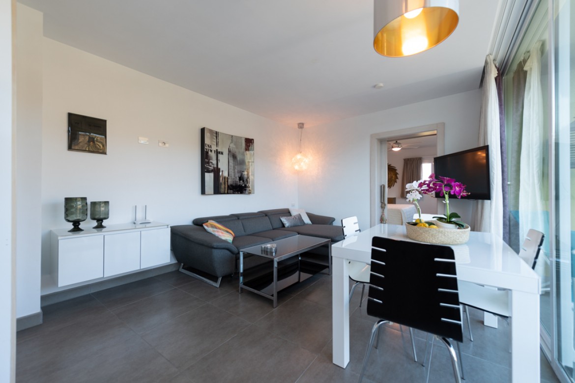 Apartamento de 45m² con un dormitorio, cocina, salón con sofa cama, comedor, cuarto de baño con plato de ducha, balcón con vistas a la piscina y solárium privado.