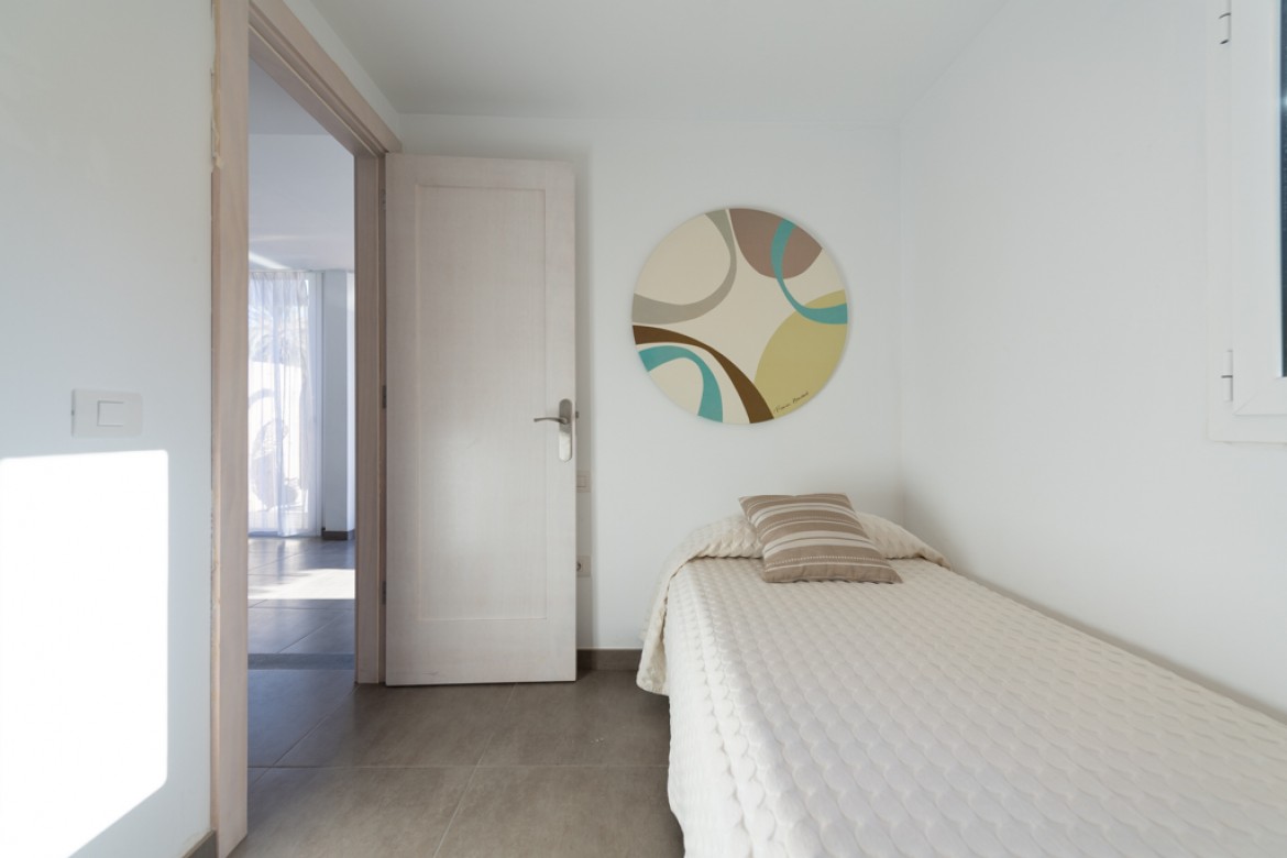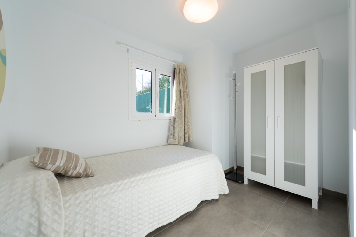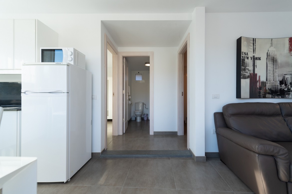 Apartamento de 40m² con dos dormitorios, cocina, salón, cuarto de baño con plato de ducha y terraza con vistas a la piscina.
