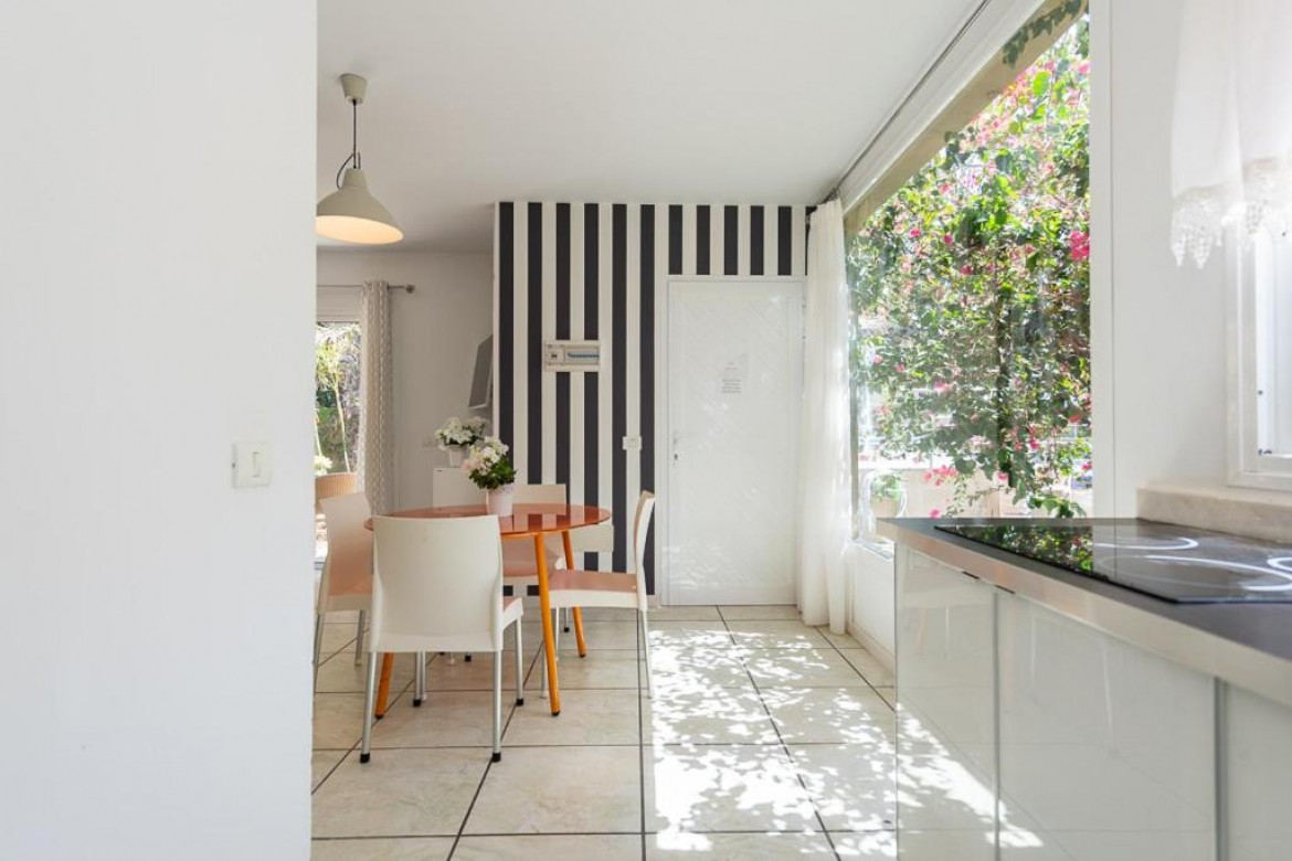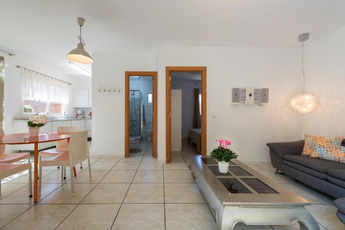 Apartamento de 45m² con un dormitorio, cocina, salón, comedor, cuarto de baño con plato de ducha y terraza con vistas al jardín.