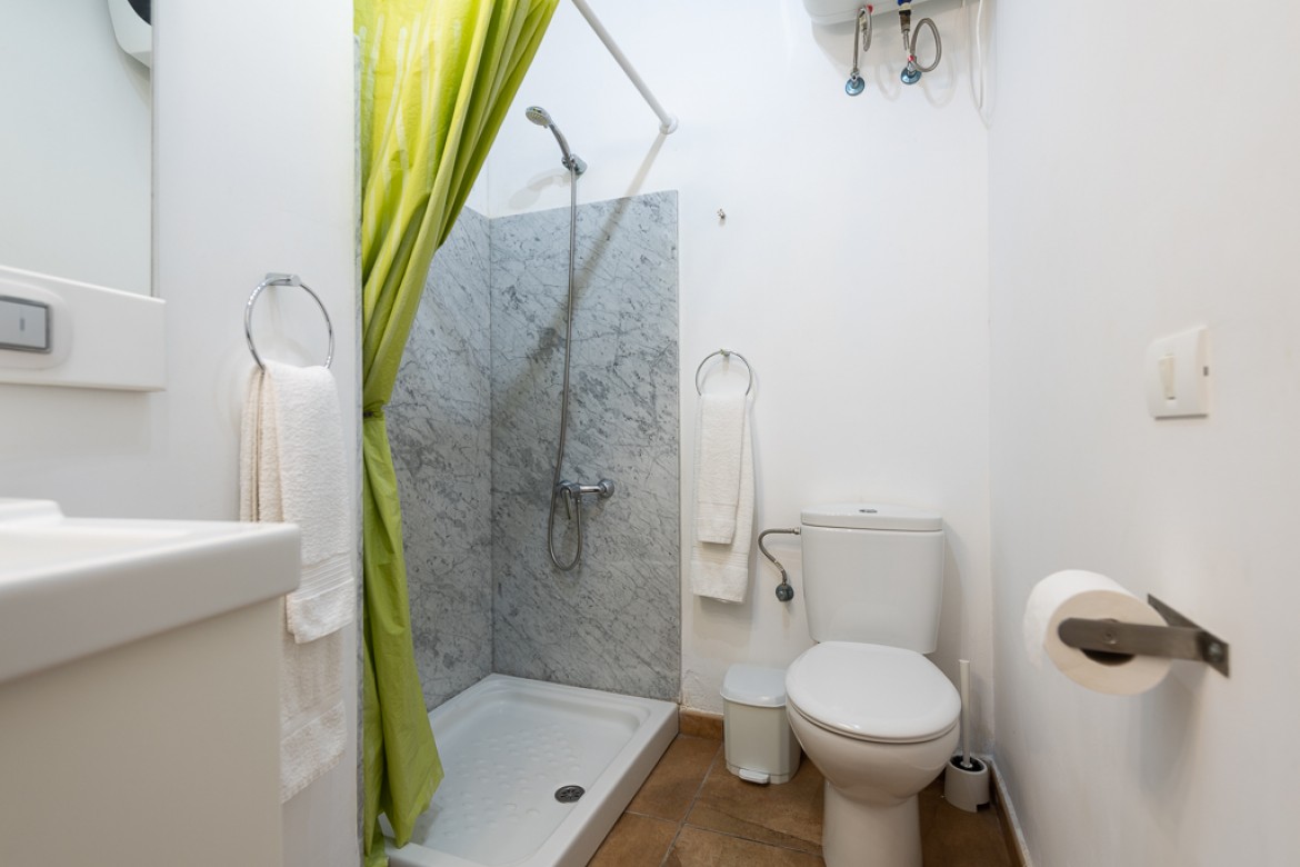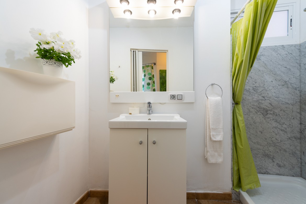 Apartamento de 30m² con un dormitorio, cocina, salón y cuarto de baño con plato de ducha.