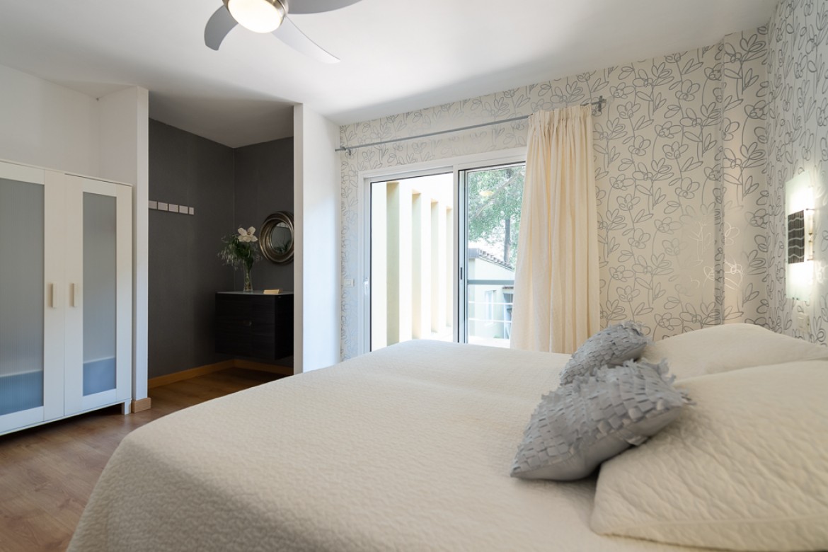 Apartamento de 70m² con dos dormitorios, cocina, salón, cuarto de baño con plato de ducha y terraza con vistas a la piscina.