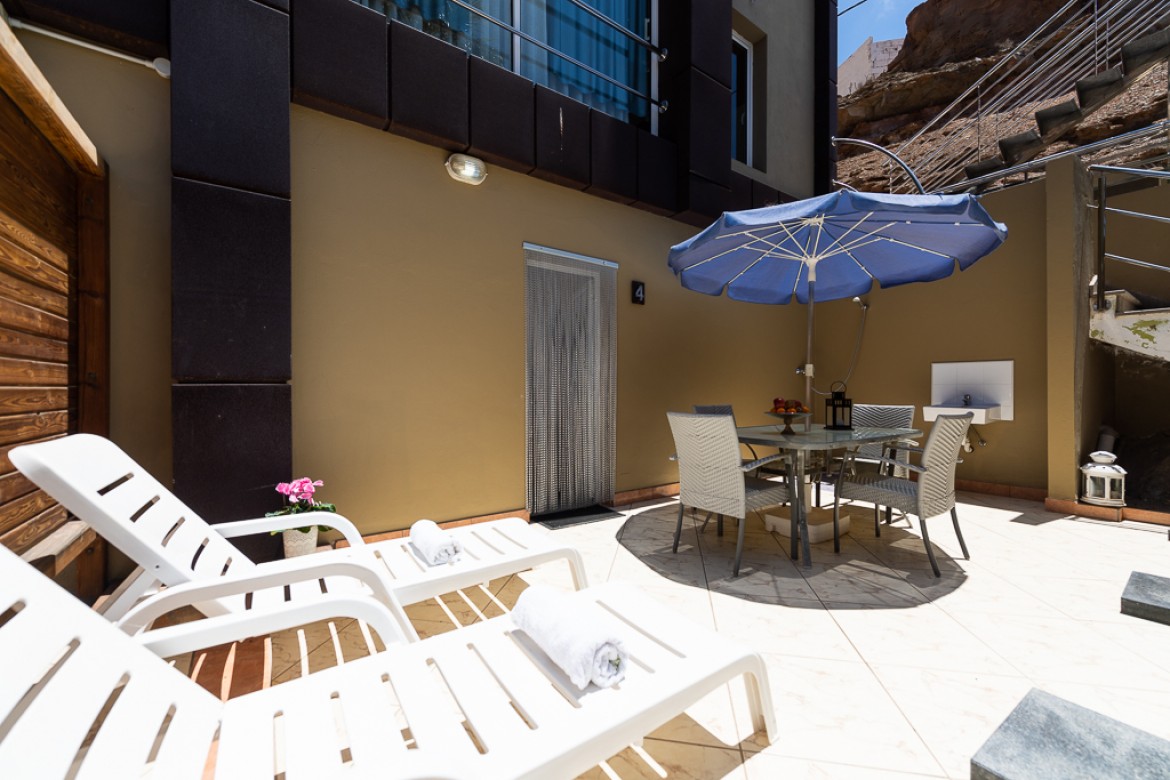 El complejo se ubica dentro de un barranco a 15 minutos caminando de la Playa del Cura; y se compone de 8 apartamentos (Estándar con una habitación ó Superior con dos habitaciones), además de las zonas comunes como la piscina, zona de barbacoa, y zona chill-out. Además ofrecemos conexión vía WIFI totalmente gratuita y parking privado gratuito. Todas los apartamentos incorporan TV satélite de pantalla plana con entrada USB, baños con plato ducha, toallas, secador de pelo, ropa de cama, cocina totalmente equipada con nevera y terraza.